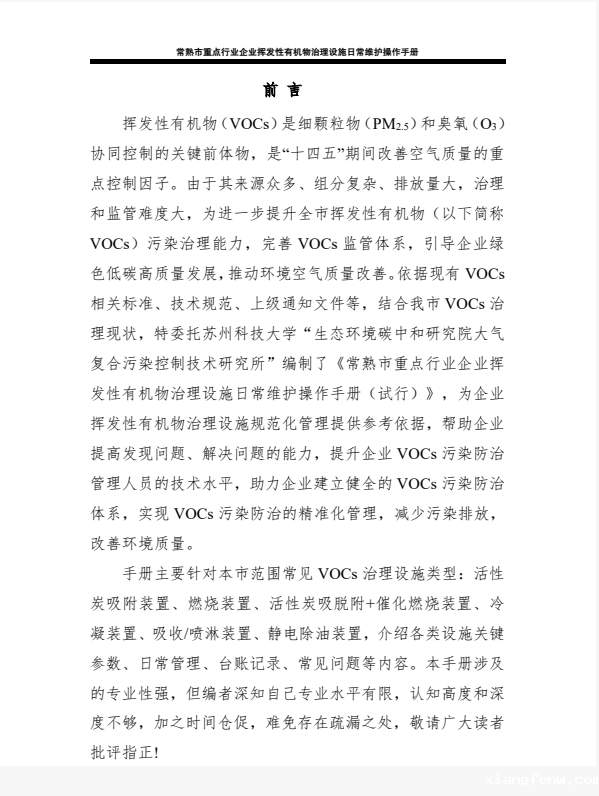 常熟市自2018年起,连续六年开展大气源清单动态更新编制工作,受常熟生态环境局委托,我院大气所在《手册》的编制经历了多年的数据统计积累,协同苏州昂诺环保科技有限公司每年对全市3000余家工业企业VOCs的基础活动水平数据进行动态更新,对重点行业排放因子及成份谱进行实测,逐步建立起了VOCs动态管控清单。《手册》分类型把源头替代、过程收集到末端治理及环境监管相关的各项管理规范、标准和要求汇集到一个手册中,化繁为简,整理成条目式的文字或者表格,方便企业查询和使用。手册适用于大气环境管理人员、环境执法人员、企业环保管理和负责人员,内容简明扼要,突出可操作性,分类写明了现场核查的规范、标准和要求,为涉VOCs排放企业自我检查、自我管理提供有力技术支撑。